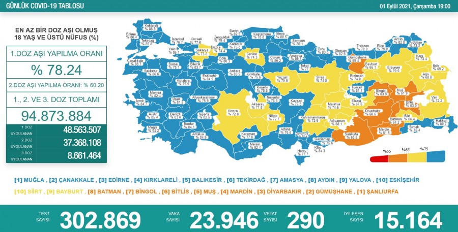 En az bir doz aşı uygulananların oranının en yüksek olduğu 10 il sırasıyla Muğla, Çanakkale, Edirne, Kırklareli, Balıkesir, Tekirdağ, Amasya, Aydın, Yalova ve Eskişehir olarak açıklandı.