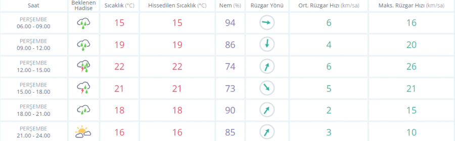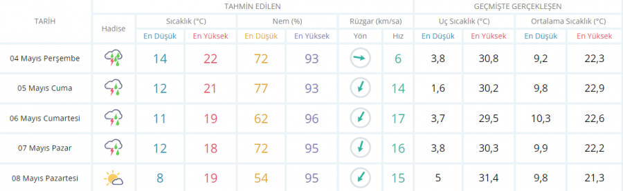 Meteoroloji Genel Müdürlüğü tarafından yapılan son değerlendirmelere göre: Ülkemizin iç ve batı kesimlerinin parçalı ve çok bulutlu, Marmara, Ege, Batı Akdeniz, Konya, Karaman, Eskişehir, Bolu ve Düzce çevreleri ile Ankara'nın batı kesimlerinin yerel olmak üzere sağanak ve gök gürültülü sağanak yağışlı, diğer yerlerin az bulutlu ve açık geçeceği tahmin ediliyor. Yağışların Marmara'nın kuzey ve doğusu, Kütahya, Denizli, Burdur, Eskişehir ve Düzce çevreleri, Aydın ve Muğla'nın iç kesimleri ile Balıkesir'in kuzey ve doğu, Çanakkale'nin doğu kesimlerinde yer yer kuvvetli olması bekleniyor.