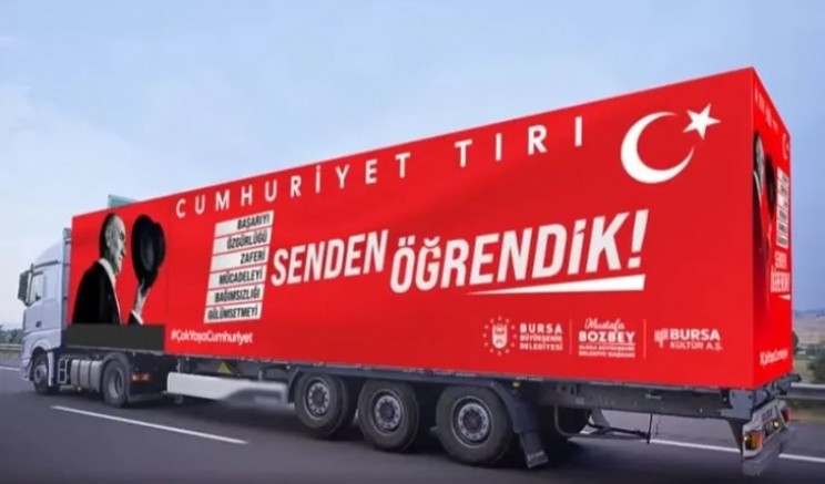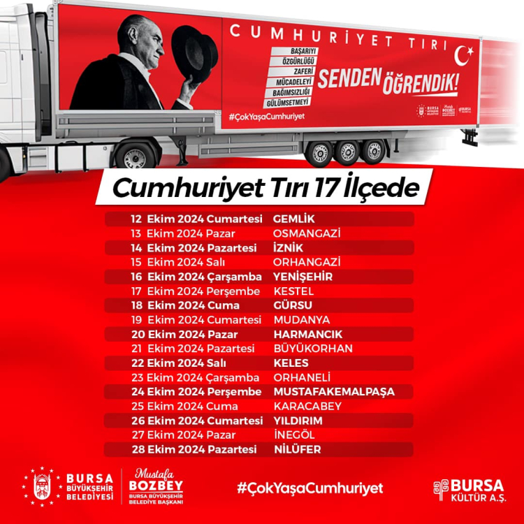 Bu yıl 101. yıl dönümü kutlanacak olan 29 Ekim Cumhuriyet Bayramı’nın heyecanı, Bursa’da şimdiden başladı. Ulu Önder Mustafa Kemal Atatürk'ün "Benim en büyük eserim" dediği Cumhuriyet'in değerlerini daha geniş kitlelerle buluşturmak amacıyla Büyükşehir Belediyesi iştiraklerinden Kültür AŞ tarafından özenle hazırlanan ‘Cumhuriyet Tırı’, yola çıktı. ‘Cumhuriyet Tırı’nın ilk durağı ise Gemlik Zeytin Dalı Meydanı oldu. 29 Ekim’e kadar her gün bir ilçeye uğrayacak olan tırda hazırlanan ‘Senden Öğrendik’ temalı Cumhuriyet Sergisi’ Bursalılarla buluşacak. Bilim Teknoloji Merkezi deney düzenekleri uygulaması, Cumhuriyet temalı kahoot yarışması, söyleşiler ve Bursa Büyükşehir Belediyesi Kent Orkestrası’nın konseriyle de vatandaşlar eğlence dolu bir gün geçirecek.