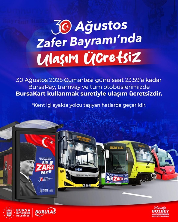Bursa Büyükşehir Belediyesi tarafından 30 Ağustos Zafer Bayramı kutlama ve etkinliklerinin coşkulu kalabalıklarla yapılabilmesi için BursaRay, Burulaş otobüsleri ve tüm Özel Halk otobüslerinde 30 Ağustos Cumartesi günü saat 23.59’a kadar ulaşımın ücretsiz olacağı belirtildi.