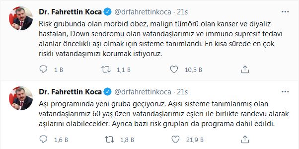 BURSA (İGFA) - Sağlık Bakanı Fahrettin Koca, sosyal medya hesabından yaptığı paylaşımda COVID-19 aşı programında yeni gruba geçildiğini duyurdu. Koca, "Aşısı sisteme tanımlanmış olan vatandaşlarımız 60 yaş üzeri vatandaşlarımız eşleri ile birlikte randevu alarak aşılarını olabilecekler. Ayrıca bazı risk grupları da programa dahil edildi" bilgisini paylaştı.
