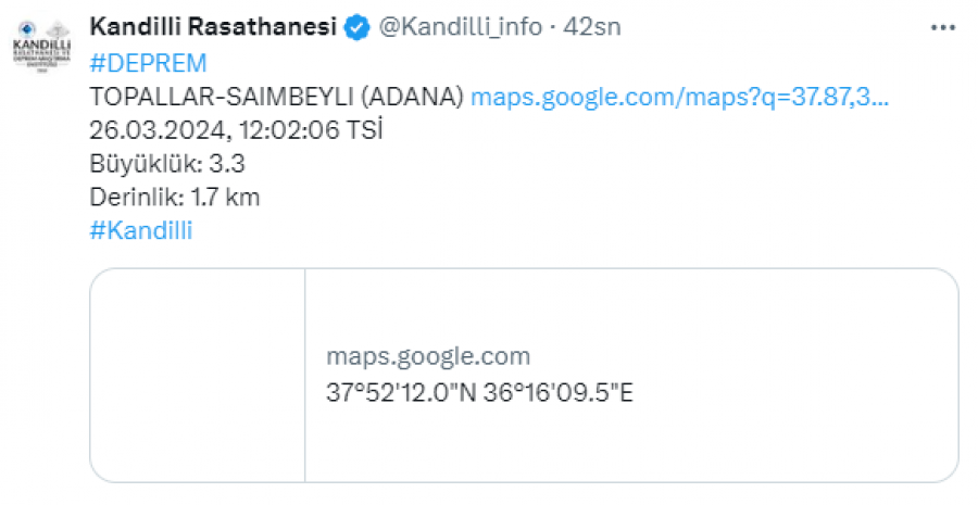 Kandilli Rasathanesi'nden edinilen bilgilere göre; Adana'nın Saimbeyli ilçesinde 3.3 büyüklüğünde deprem meydana geldi.