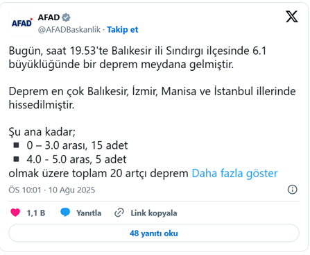 Afet ve Acil Durum Yönetimi Başkanlığı (AFAD), 19.53'te Balıkesir'in Sındırgı ilçesinde 6,1 büyüklüğünde meydana gelen depremin ardından saat 22.00 itibariyle 0 ve 3.0 arası büyüklükte 15, 4.0 ve 5.0 arası büyüklükte ise 5 adet olmak üzere toplam 20 artçı kaydedildiğini aktardı. AFAD ayrıca bölgedeki arama kurtarma çalışmalarında 319 personelin ve 79 aracın görev yapmakta olduğunu da belirtti.