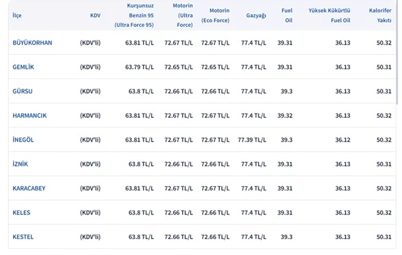 Bursa akaryakıt fiyatları
