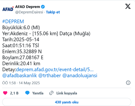 Afet ve Acil Durum Yönetimi Başkanlığı (AFAD) verilerine göre, saat 01.51'de Akdeniz açıklarında, Muğla'nın Datça ilçesine 155 kilometre mesafede 6.0 büyüklüğünde bir deprem meydana geldi.