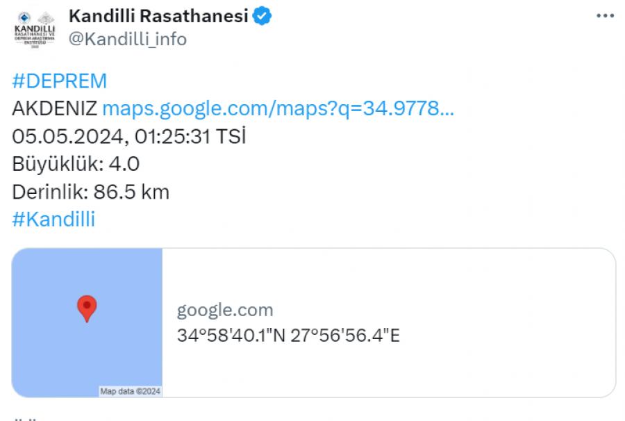 Kandilli Rasathanesi'nden edinilen bilgiye göre; Akdeniz açıklarında 4 büyüklüğünde deprem meydana geldi.