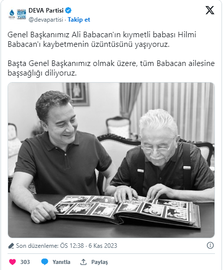 "Genel Başkanımız Ali Babacan'ın kıymetli babası Hilmi Babacan'ı kaybetmenin üzüntüsünü yaşıyoruz.