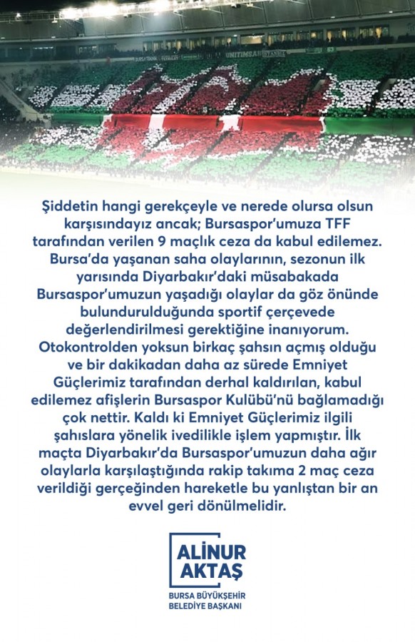 Bursa Büyükşehir Belediye Başkanı Alinur Aktaş açıklamasında, "Şiddetin hangi gerekçeyle ve nerede olursa olsun karşısındayız ancak; Bursaspor'umuza TFF tarafından verilen 9 maçlık ceza da kabul edilemez. Bursa'da yaşanan saha olaylarının, sezonun ilk yarısında Diyarbakır'daki müsabakada Bursaspor'umuzun yaşadığı olaylar da göz önünde bulundurulduğunda sportif çerçevede değerlendirilmesi gerektiğine inanıyorum. Otokontrolden yoksun birkaç şahsın açmış olduğu ve bir dakikadan daha az sürede Emniyet Güçlerimiz tarafından derhal kaldırılan, kabul edilemez afişlerin Bursaspor Kulübü'nü bağlamadığı çok nettir. Kaldı ki Emniyet Güçlerimiz ilgili şahıslara yönelik ivedilikle işlem yapmıştır. İlk maçta Diyarbakır'da Bursaspor'umuzun daha ağır olaylarla karşılaştığında rakip takıma 2 maç ceza verildiği gerçeğinden hareketle bu yanlıştan bir an evvel geri dönülmelidir" ifadelerinde bulundu.