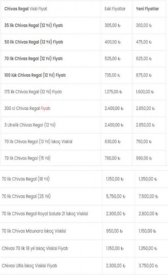 Bugünden geçerli olmak üzere 35 lik Chivas Regal 305,00 TL'den 360,00 TL'ye, 50 lik Chivas Regal fiyatı 400,00 TL'den 475,00 TL'ye yükseldi. 70 lik Chivas Regal fiyatı 525,00 TL'den 625,00 TL'ye ve 100 lük Chivas fiyatı ise 735,00 TL'den 875,00 TL'ye çıktı.