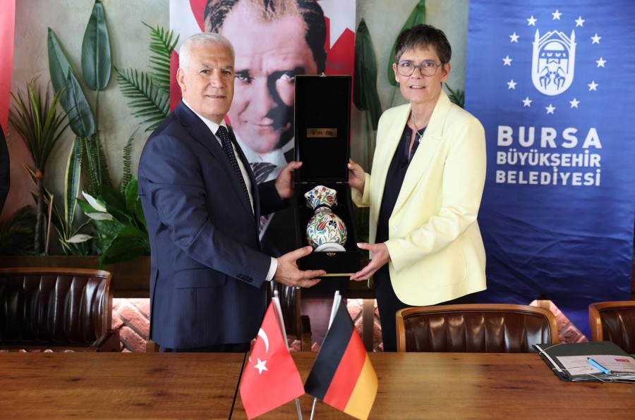 Bursa'da vatandaşların talep ve önerilerini yerinde dinleyerek çözüm üretmek amacıyla düzenlenen 'Başkan Bozbey Burada' projesi kapsamında İnegöl'de çeşitli temaslarda bulunan Büyükşehir Belediye Başkanı Mustafa Bozbey, Almanya Federal Cumhuriyeti Rheinland-Pfalz Eyaleti Ekonomi, Ulaştırma, Tarım ve Bağcılık Bakanlığı Devlet Sekreteri Petra Dick-Walther ve beraberindeki heyeti Gastro İnegöl'de ağırladı. Samimi bir ortamda gerçekleşen ziyarette, yerel üreticiler ile uluslararası aktörler arasında kurulacak yeni iş birlikleri ele alındı.