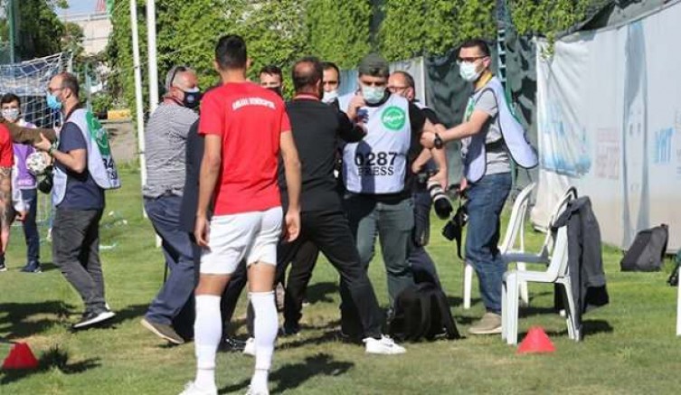 TFF 2. Lig Play-off Çeyrek Finali'nde Ankara Demirspor'un sahasında Kocaelispor'u konuk ettiği maçın 43. dakikasında, Ankara Demirsporlu futbolcular, kale arkasında görevini yapmakta olan İhlas Haber Ajansı (İHA) foto muhabiri Yunus Emre Kartal'a önce sözlü ardından fiziki saldırıda bulundu.