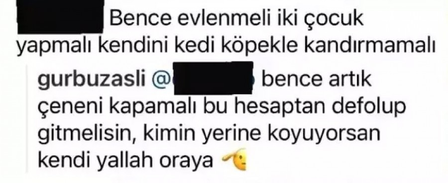 Yoruma çok sinirlenen ve kayıtsız kalamayan Aslıhan Gürbüz, takipçisine, "Bence artık çeneni kapamalı, bu hesaptan defolup gitmelisin. Kendini kimin yerine koyuyorsan yallah oraya" ifadeleriyle sert bir cevap verdi.