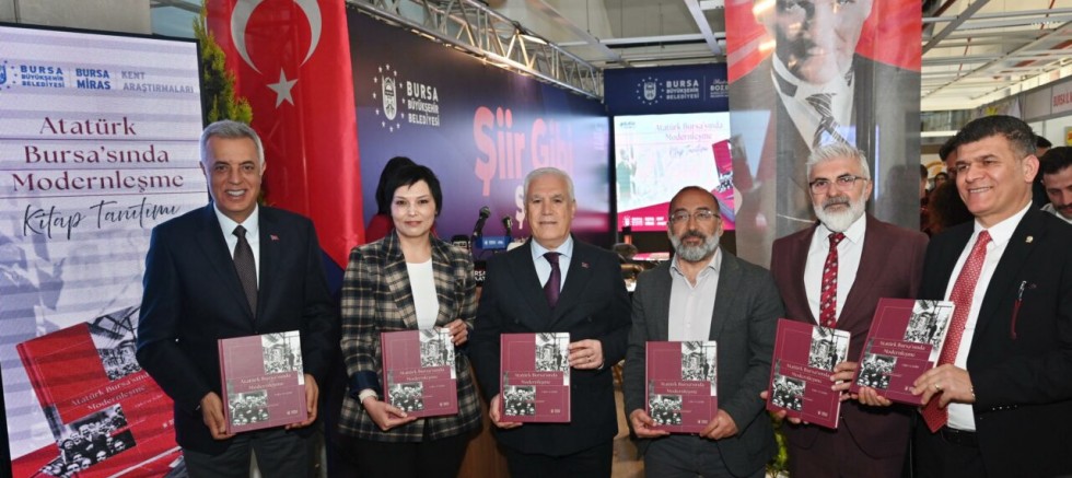 Bursa’nın somut olmayan kültürel mirasına katkılarını yeni yayınlarla sürdüren Büyükşehir Belediyesi, kenti değerleriyle geleceğe taşımaya devam ediyor. Kent Tarihi ve Tanıtımı Dairesi Başkanlığına bağlı Kent Tarihi Araştırmaları ve Arşiv Şube Müdürlüğü tarafından kent hafızasına kazandırılan ve Kültür AŞ yayınlarından çıkan “Atatürk Bursa’sında Modernleşme” adlı kitabın tanıtımı, Bursa 22. Kitap Fuarı’nda yapıldı. Bursa Uludağ Üniversitesi Fen-Edebiyat Fakültesi Öğretim Üyesi Doç. Dr. Hacer Karabağ’ın hazırladığı kitabın tanıtım etkinliğine, Bursa Büyükşehir Belediye Başkanı Mustafa Bozbey’in yanı sıra Büyükşehir Belediyesi Genel Sekreteri Doç. Dr. Ergül Halisçelik, Genel Sekreter Yardımcısı Mehmet Yıldız, Kent Tarihi ve Tanıtımı Dairesi Başkanı Güney Özkılınç, Kültür AŞ Genel Müdürü Yankı İçöz ve kitapseverler katıldı.