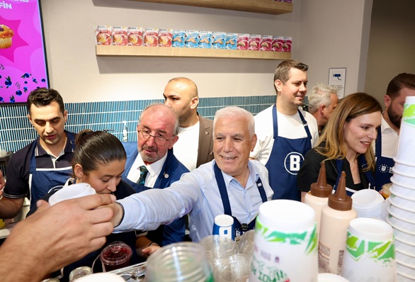 Açılış kurdelesinin kesilmesinin ardından Başkan Mustafa Bozbey ve eşi Seden Bozbey, protokol üyeleri ile birlikte barista önlüklerini giyerek vatandaşlara kahve ikramında bulundu.