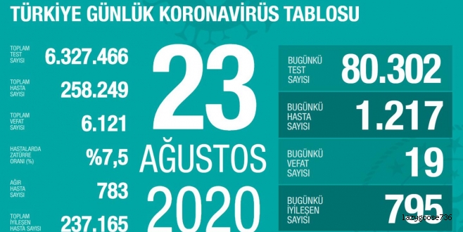 Son 24 saatte 19 hasta vefat etti, 795 kişi iyileşti. Kovid-19 tedavisi tamamlananların sayısı 237 bin 165'e çıktı.