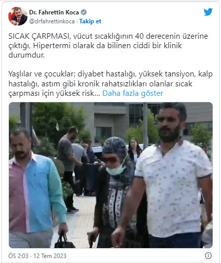 Videolu bir şekilde paylaşım yapan Sağlık Bakanı Fahrettin Koca, vatandaşların sıcakta yaşayabileceği sıkıntıları belirtti. Vatandaşlara evde kalmaları uyarılarında bulunan Koca, özellikle hastalığı bulunan kişilerin daha dikkatli olmaları noktasında uyardı.
