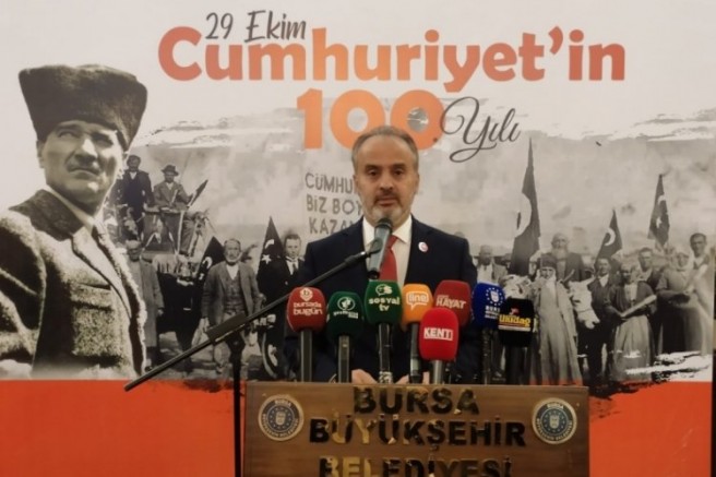 Tarihi Heykel binasında Bursa Büyükşehir Belediye Başkanı Alinur Aktaş'ın katılımıyla Cumhuriyetin 100'ncü yılına yönelik kutlama programlarının tanıtım toplantısında konuşan Aktaş, 29 Ekim'de ulaşımın ücretsiz olduğunu duyurdu.