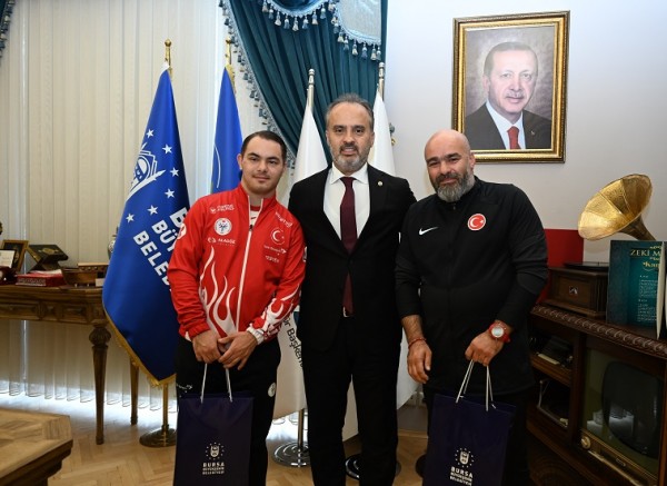 İtalya’da düzenlenen Down Sendromlular Avrupa Şampiyonası’nın final maçında Portekiz’i 2-1 yenerek şampiyonluğa ulaşan Down Sendromlu Özel Futsal Milli Takımı’nın Bursalı sporcusu Birkan Dikici ve Bursalı kaleci antrenörü İlyas Sarı, Büyükşehir Belediye Başkanı Alinur Aktaş’ı ziyaret etti. Tarihi Belediye Binası’nda gerçekleşen ziyarette, Gençlik ve Spor Hizmetleri Dairesi Başkanı Yunus Kaldırım, Sosyal Hizmetler Dairesi Başkanı Hüseyin Buran ve Tarım Peyzaj AŞ Genel Müdürü Semih Polat da hazır bulundu.