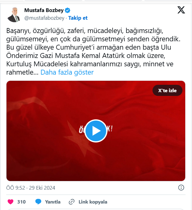 Bursa Büyükşehir Belediye Başkanı Mustafa Bozbey, 29 Ekim Cumhuriyet Bayramı'nı sosyal medya hesaplarından kutladı.