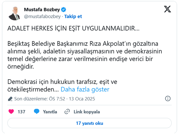 Bursa Büyükşehir Belediyesi Başkanı Mustafa Bozbey, Beşiktaş Belediye Başkanı Rıza Akpolat'ın Balıkesir'de gözaltına alınması üzerine sosyal medya hesabından bir açıklama yaptı. Bozbey açıklamasında, "Adalet herkes için eşit uygulanmalıdır. Beşiktaş Belediye Başkanımız Rıza Akpolat'ın gözaltına alınma şekli, adaletin siyasallaşmasının ve demokrasinin temel değerlerine zarar verilmesinin endişe verici bir örneğidir. Demokrasi için hukukun tarafsız, eşit ve ötekileştirmeden uygulanması gerekmektedir. Adaletin siyasi bir araca dönüştürülmesinin ülkemizin geleceğini olumsuz etkileyeceğini sorumluluk duyan herkesin bilmesi gerekir. Başkanımızın yanındayız ve demokratik değerlerimizi, halkımızın iradesini korumak adına adaletin er ya da geç mutlaka tecelli edeceğine inanıyorum" dedi.