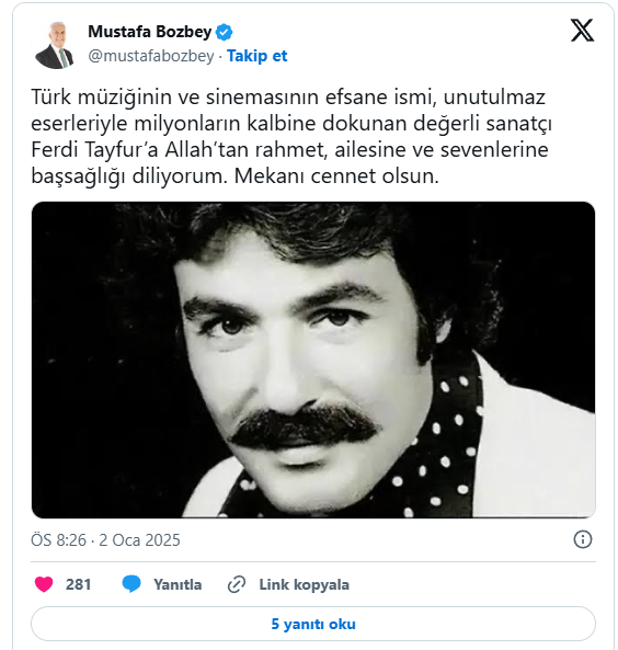 Arabesk müziğin efsane ismi 79 yaşındaki sanatçı Ferdi Tayfur hayatını kaybetti. Bunun üzerine Bursa Büyükşehir Belediye Başkanı Mustafa Bozbey sosyal medya hesabından bir paylaşım yaptı. Bozbey paylaşımında, "Türk müziğinin ve sinemasının efsane ismi, unutulmaz eserleriyle milyonların kalbine dokunan değerli sanatçı Ferdi Tayfur'a Allah'tan rahmet, ailesine ve sevenlerine başsağlığı diliyorum. Mekanı cennet olsun" dedi.