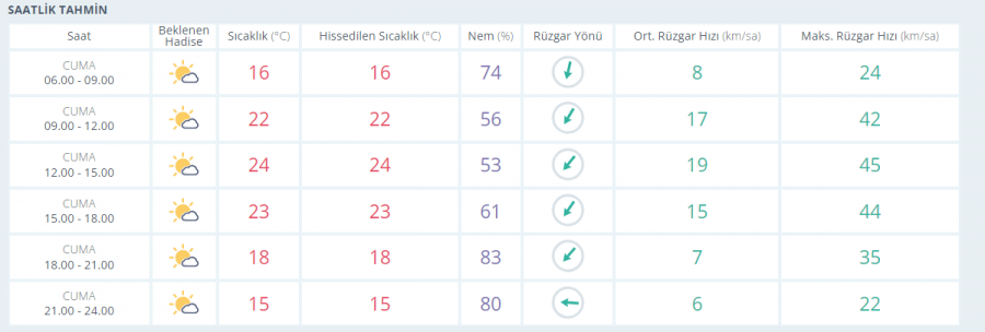 Parçalı ve az bulutlu zamanla çok bulutlu, iç kesimlerinin öğle saatlerinden sonra kısa süreli ve yerel sağanak ve gök gürültülü sağanak yağışlı geçeceği tahmin ediliyor. Gece ve sabah saatlerinde yer yer pus ve yer yer sis bekleniyor.