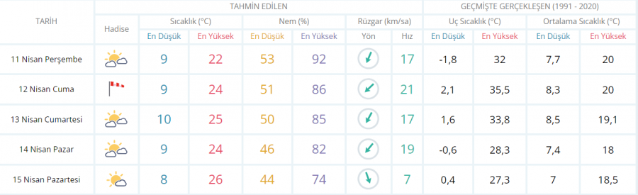 Parçalı ve az bulutlu geçeceği tahmin ediliyor. Sabah ve gece saatlerinde doğusunda pus, yer yer sis bekleniyor. Rüzgarın, bölgenin güneybatısında kuzeyli yönlerden kuvvetli (40-60 km/saat) esmesi bekleniyor.