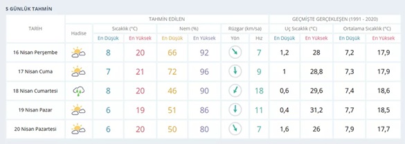 Haftanın tek yağışlı günü cumartesi olacak. Yer yer sağanak yağış beklenirken sıcaklık 8 ile 20 derece arasında değişecek. Nem oranı düşse de rüzgar zaman zaman kuvvetini artırarak 18 km/s hıza ulaşabilecek.