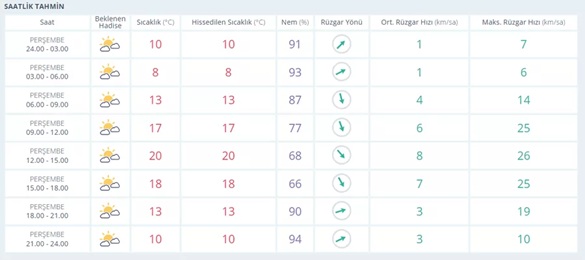 Parçalı bulutlu hava devam ediyor. Sabah saatlerinde serinlik hissedilirken gün içinde sıcaklık 21 dereceye kadar çıkıyor. Nem oranı %72-96 aralığında. Rüzgar hızında hafif artış bekleniyor.