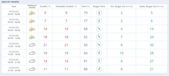 Yağış devam ederken rüzgâr kuvvetini artırıyor. Sıcaklık 6 ila 14 derece arasında değişecek. Nem oranı yüzde 66-95 aralığında, rüzgârın hızı 21 km/saate kadar çıkacak.