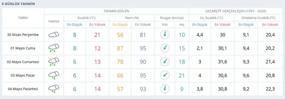 Haftanın ilk gününde parçalı bulutlu bir hava bekleniyor. Sıcaklık en düşük 8, en yüksek 21 derece olacak. Nem oranı yüzde 56-81 arasında değişirken, rüzgâr 10 km/saat hızla esecek.