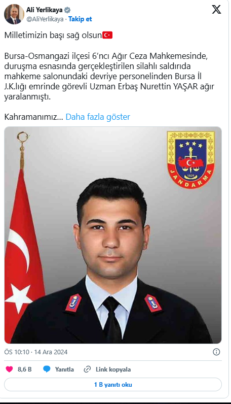 Milletimizin başı sağ olsun Bursa-Osmangazi ilçesi 6'ncı Ağır Ceza Mahkemesinde, duruşma esnasında gerçekleştirilen silahlı saldırıda mahkeme salonundaki devriye personelinden Bursa İl J.K.lığı emrinde görevli Uzman Erbaş Nurettin YAŞAR ağır yaralanmıştı. Kahramanımız kaldırıldığı hastanede yapılan tüm müdahalelere rağmen maalesef bugün şehit oldu. Çok üzgünüz... Şehidimize Allah'tan rahmet; ailesine, Jandarma Teşkilatımıza ve Milletimize başsağlığı diliyorum. Şehidimizin makamı âli olsun.