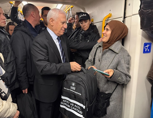 Bursa Büyükşehir Belediye Başkanı Mustafa Bozbey, daha sonra Beşeveler BursaRay İstasyonu’ndan metroya binerek vatandaşlarla birlikte Şehreküstü İstasyonu’na kadar yolculuk yaptı. Başkan Mustafa Bozbey tarafından vatandaşlara AKOM tarafından hazırlanan ve içinde ilk yardım kiti, battaniye, radyo, el feneri, diş fırçası, yağmurluk, düdük ve çöp torbası bulunan afet ve acil durum çantaları dağıtıldı. Yolculuk boyunca Bursalılarla afet konusunda sohbet eden Başkan Mustafa Bozbey, afetlere hazırlıklı olmanın önemine vurgu yaptı.