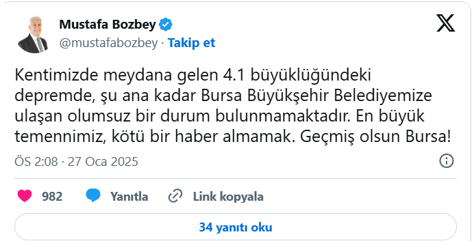 Bozbey'in açıklaması şöyle, "Kentimizde meydana gelen 4.1 büyüklüğündeki depremde, şu ana kadar Bursa Büyükşehir Belediyemize ulaşan olumsuz bir durum bulunmamaktadır. En büyük temennimiz, kötü bir haber almamak. Geçmiş olsun Bursa!"