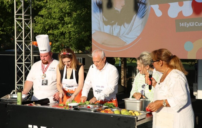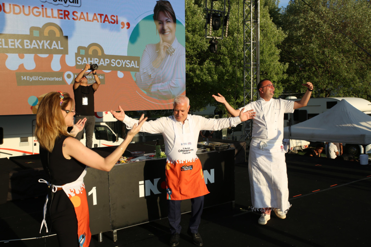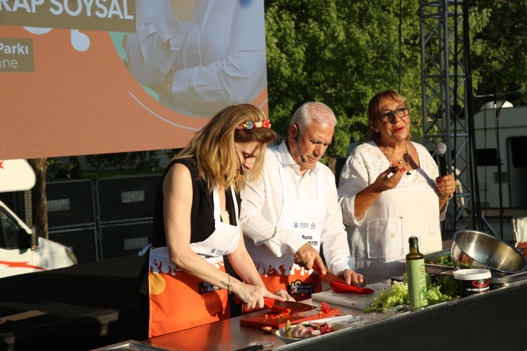 Bursa Büyükşehir Belediyesi’nin ‘Damağımdaki Bursa’ temasıyla bu yıl üçüncüsünü düzenlendiği ‘Bursa Uluslararası Gastronomi Festivali, kentin unutulmaya yüz tutmuş lezzetlerini ve zengin mutfak kültürünü gastronomi tutkunlarıyla buluşturmaya devam ediyor. Etkinlik kapsamında Sahrap Soysal ve Melek Baykal ile birlikte mutfağa giren Başkan Mustafa Bozbey ve eşi Seden Bozbey, Bursa’nın coğrafi tescilli ürünlerini kullanarak ‘Bursa Dudugiller Salatası’ hazırladı.