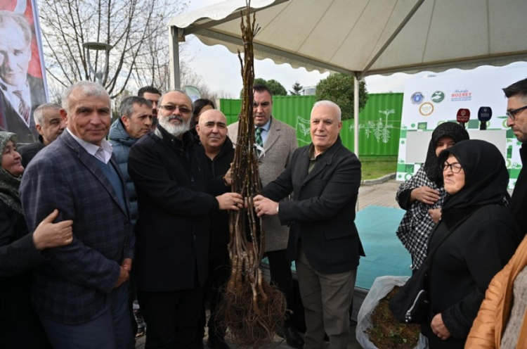 Konuşmaların ardından Başkan Mustafa Bozbey tarafından üreticilere fide ve fidanlar teslim edildi. - BÜLTEN