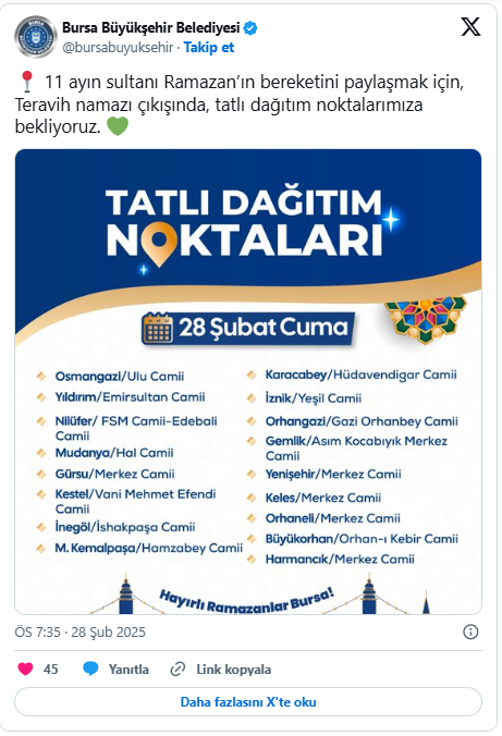 Bursa Büyükşehir Belediyesi resmi sosyal medya hesabından yaptığı paylaşımda Teravih namazı çıkışında yapacağı tatlı dağıtım noktalarının bilgisini verdi. Yapılan paylaşımda, "11 ayın sultanı Ramazan'ın bereketini paylaşmak için, Teravih namazı çıkışında, tatlı dağıtım noktalarımıza bekliyoruz" dendi.