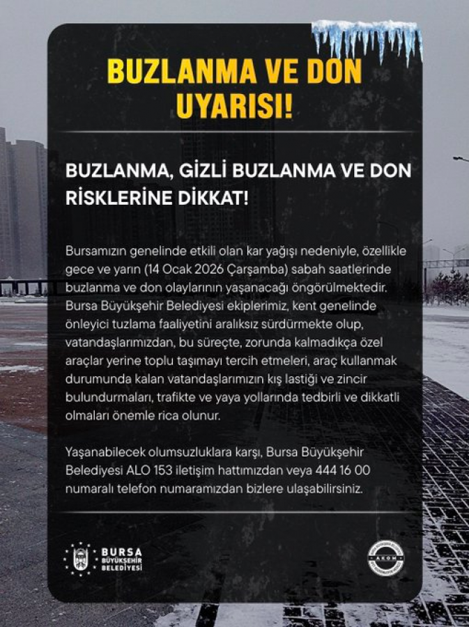 Bursamızın genelinde etkili olan kar yağışı nedeniyle, özellikle gece ve yarın (14 Ocak 2026 Çarşamba) sabah saatlerinde buzlanma ve don olaylarının yaşanacağı öngörülmektedir.