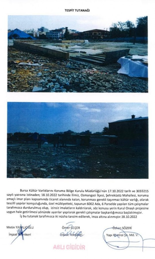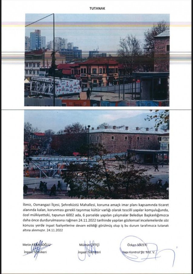 Projenin onay sürecinin tamamlanmaması, Koruma Kurulu Kararları ve Büyükşehir Belediyesi'nin izinsiz uygulamayı durdurmasına rağmen, imalatların durmadığı tespit edildi.