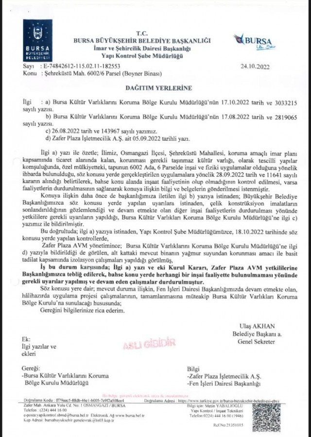 Üst katları yıkılan AVM'nin yıkım sonrası kalan alanlarının düzenlenmesi ve zemin altında kalan katlara giriş için yapılacak imalatları içeren projenin Koruma Kurulu'ndan onay alması gerekirken, onay süreci tamamlanmadan imalata izinsiz başlandığı tespit edildi. Büyükşehir ekipleri tarafından 24 Kasım'da yerinde yapılan ikinci incelemede imalatların durdurulmayıp, devam ettiği tespit edilince, yeniden tutanak tutuldu. İnşai faaliyetin durdurulması, izinsiz uygulamaların kaldırılması ve alanın onaylı projeye uygun hale getirilmesi için Büyükşehir Belediyesi tarafından hukuki süreç başlatıldı.