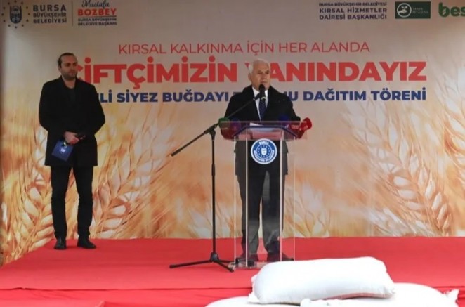 Bursa Büyükşehir Belediye Başkanı Mustafa Bozbey, Bursa’nın bereketli topraklarında üreten ellerin emeğine destek olmaya ve bu toprakların potansiyelini daha da artırmaya devam edeceklerini söyledi. Anadolu’nun kadim tohumlarından biri olan siyez buğdayının, binlerce yıllık geçmişiyle özel bir değer olduğunu belirten Başkan Mustafa Bozbey, 10 bin yıldır tarımı yapılan siyez buğdayının bugün kullanılan modern buğdayın atası olduğunu hatırlattı. Genetik yapısında herhangi bir değişim olmadığından GDO içermediğini ifade eden Başkan Bozbey, “Siyez buğdayının üretimini destekleyerek hem tarımsal çeşitliliği korumak hem de sağlıklı ve besleyici gıdalara erişimi artırma hedefindeyiz. Bu projeyle yaklaşık 233 hektarlık alanda üretim yapılacaktır. Belediye olarak üreticilerimize yüzde 75 hibe oranıyla destek oluyoruz. 25 üreticimize 5850 kilogram siyez buğdayı tohumu dağıtıyoruz. Ekilen tüm siyez buğdayını Bursa Büyükşehir Belediyesi olarak alacağız. Üreticimize hem destek olacağız hem de Bursalılara sağlıklı ürünü götürmüş olacağız. Bu toprakların bereketini geleceğe taşıyan çiftçilerimizdir” dedi.