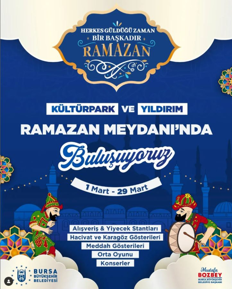 Bursa Büyükşehir Belediyesi tarafından Kültürpark ve Yıldırım eski İhtisas Hastanesi alanında kurulan Ramazan Meydanlarında çok sayıda kültür ve sanat programı da planlandı. Kültür ve Sosyal İşler Dairesi Başkanlığı, Dış İlişkiler Dairesi Başkanlığı ve Kültür AŞ işbirliğiyle 1-29 Mart tarihleri arasında sihirbaz gösterisi, Karagöz-Hacivat gölge oyunu, danışık gecesi, tiyatro, konser, orta oyunu, söyleşi, sahne gösterileri, tasavvuf programları gibi birçok etkinlik Bursalıları bekliyor olacak. Kültürpark Ramazan Meydanı’nda moderatörlüğünü Mesut Yavaş’ın üstleneceği ve birbirinden önemli isimlerin konuşmacı olarak katılacağı canlı yayın programları ise BBBTV ve Büyükşehir Belediyesi hesaplarından yayınlanacak. Ramazan ayı boyunca Merinos Atatürk Kongre Kültür Merkezi, Tayyare Kültür Merkezi, Mevlevihane ve Muradiye El Yazmaları Müzesi’nde iftar programları, sergiler, sohbetler, dinletiler ve konserler gibi etkinlikler de düzenlenecek.