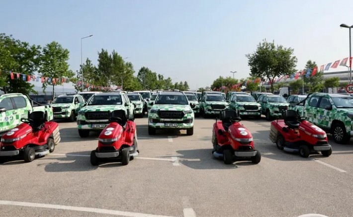 ‘Yeniden Yeşil Bursa’ hedefiyle çalışmalarını kararlılıkla sürdüren Büyükşehir Belediyesi, faaliyetleri daha etkili ve verimli yürütebilmek adına ekipmanları, araçları ve teknik imkânları güçlendirmeye devam ediyor. Bu kapsamda Bursa’nın yeşil alanlarının bakımını çevreci ve hızlı bir biçimde yapabilmek adına Tarım Peyzaj A.Ş. bünyesine kazandırılan yeni araçlar düzenlenen törenle hizmete alındı. Yaklaşık 1100 çalışan, 195 ekipman ve 174 araçlık filosuyla kentin dört bir yanında görev yapan Tarım Peyzaj AŞ’nin filosuna, 5 yeni kamyon ve tanker, 13 adet 4x4 pick-up, 16 adet çift kabin kamyonet, son teknoloji çim biçme traktörleri, çim biçme araçları ve ilave biçme motorları eklendi.