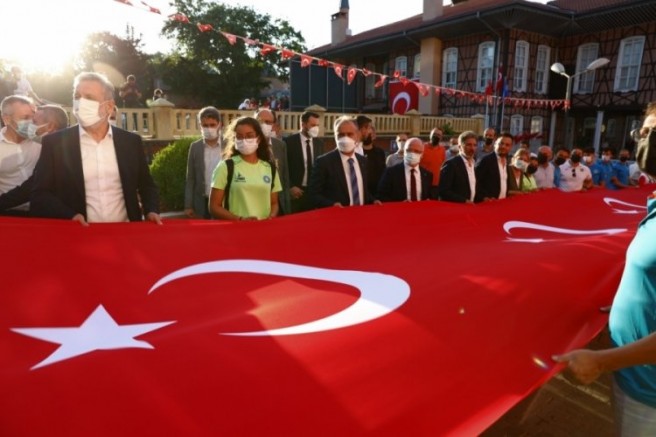 Bursa Valiliği'nin koordinasyonunda Bursa Büyükşehir Belediyesi tarafından düzenlenen 15 Temmuz Demokrasi ve Milli Birlik Günü etkinlikleri kapsamında bayrak yürüyüşü düzenlendi. Büyükşehir Belediye Başkanı Alinur Aktaş, AK Parti İl Başkanı Davut Gürkan, AK Parti MKYK üyesi Ayhan Salman ve BTSO Başkanı İbrahim Burkay'ın da katıldığı yürüyüşte, Bursalılar, Türk Bayrağı açarak Cumhuriyet Caddesi'nden Demokrasi Meydanı'na kadar yürüdü. Büyükşehir Belediye Bandosu'nun marşlarıyla coşku doruğa çıkarken, vatandaşlar da alkışlarıyla yürüyüşe destek verdi.