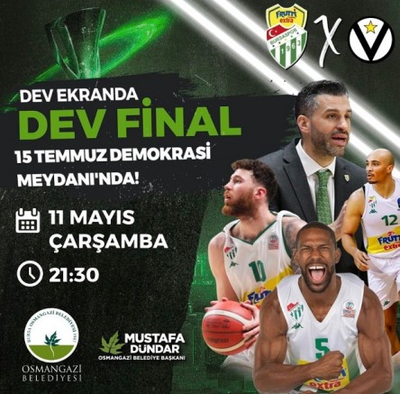 Yeşil-Beyazlı camiaya tarihindeki ilk Avrupa Şampiyonluğunu kazandırmak için bu akşam İtalya’da final maçına çıkacak olan Frutti Extra Bursaspor’a Bursalılar ekranları başından destek verecek. Osmangazi Belediyesi de dev maçı vatandaşların hep birlikte izleyebilmeleri için 15 Temmuz Demokrasi Meydanı’na dev ekran kuracak.