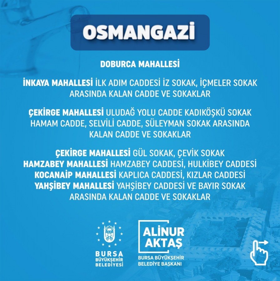Bursa Büyükşehir Belediye Başkanı Alinur Aktaş Bursa'da bazı bölgelerde 24 saat su kesintisi olacağı sosyal medya hesabından paylaştı.