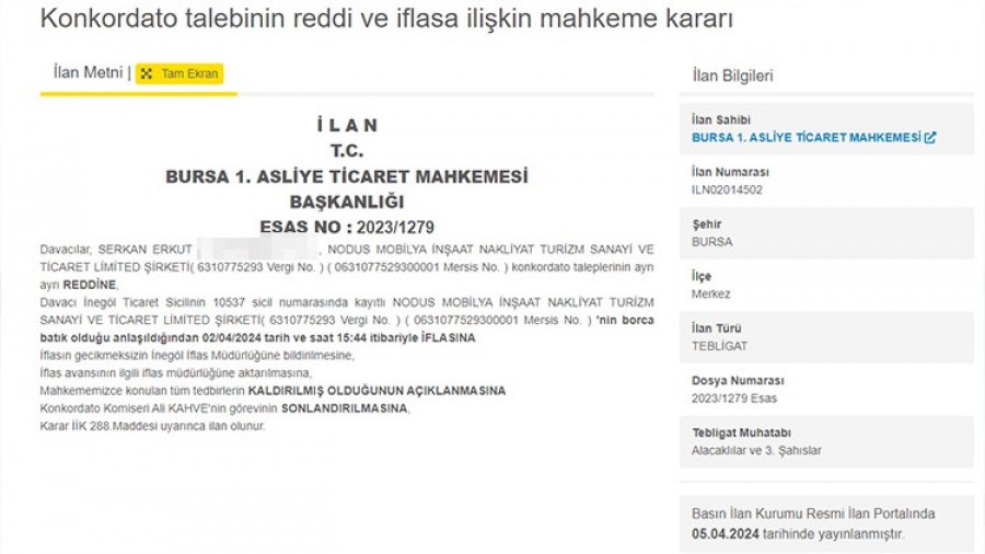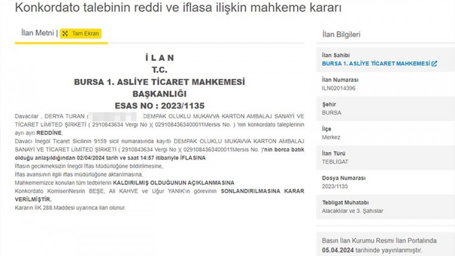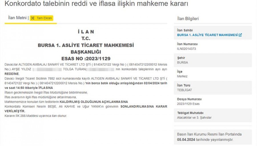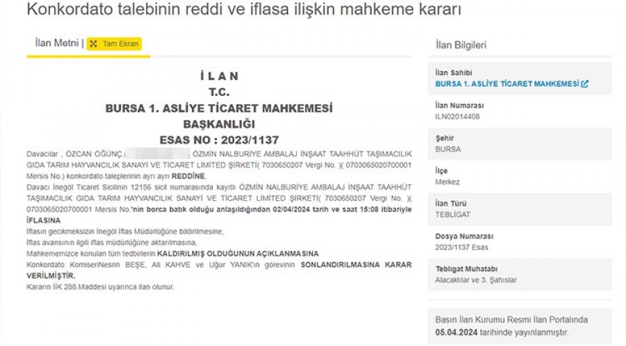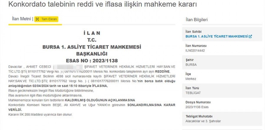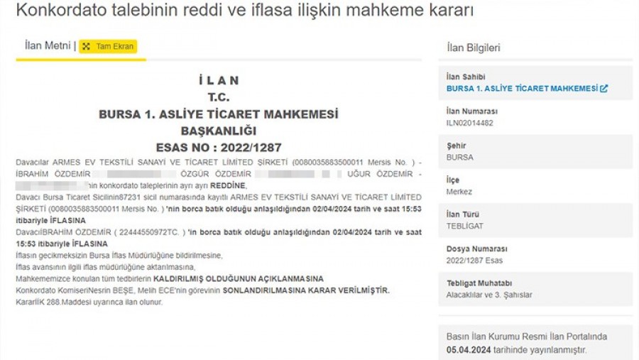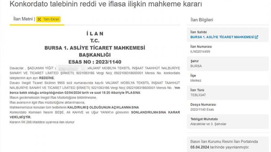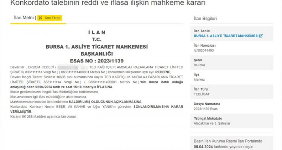 Yayınlanan ilana göre Bursa 1. Asliye Ticaret Mahkemesi konkordato taleplerini reddettiği 8 firmanın iflas ettiği açıklandı.