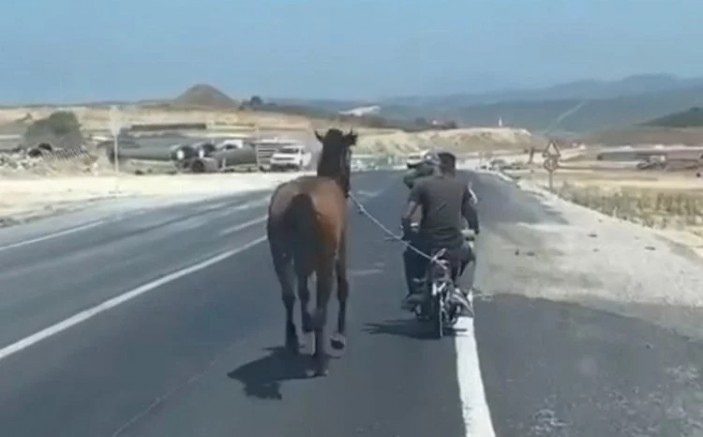 Olay, Karacabey ilçesi Taşpınar Mahallesi’nde meydana geldi. Edinilen bilgiye göre, bir kişi motosikletine iple bağladığı atı koşturarak götürdü. O anlar trafikteki başka bir sürücünün cep telefon kamerasına yansıdı.