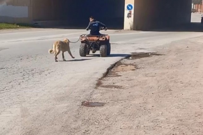 Bursa'da bir kişi, kangal cinsi köpeğini ATV motoruna bağladı.