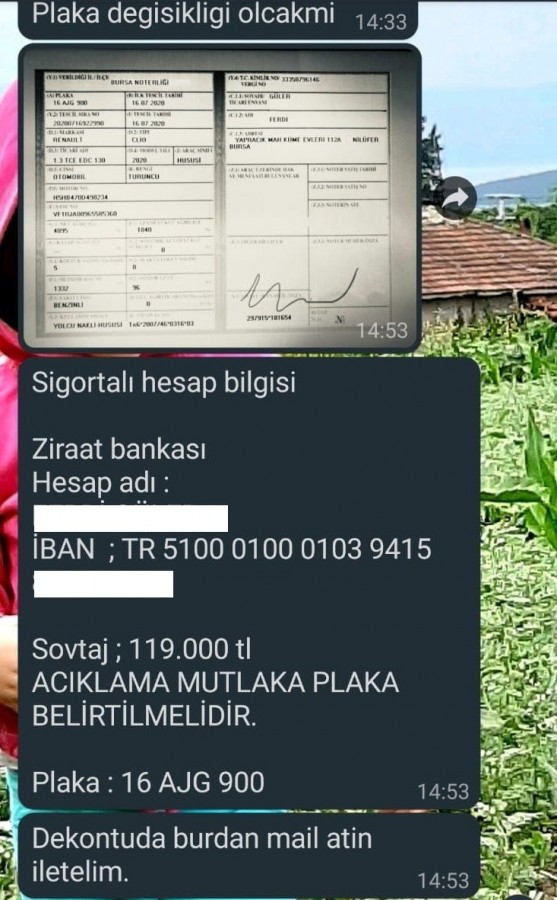 Bütün işlemleri hemen hallederek otomobili almaya geldiklerini ifade eden Mücahit Şahin, "İnternet üzerinden arabayı gördük ve Bursa teslim olduğunu öğrendik. İrtibat numarasını aradık. Aracın bedeli olan 126 bin 500 lira üzerinden pazarlık yaparak 123 bin 500 liraya düştük. Sonra satıcıyı aradığımızda, 'Biz hasarlı oto alım-satım işi yapıyoruz' dedi. Fiyatın 119 bin lirasının, sigortalı araç sahibinin hesabına yatacağını söyledi. Noterden oto alım vekâleti vermemizi istedi. 'Ruhsat geldikten sonra size hesap bilgilerini vereceğiz. 119 bin lira şahsın hesabına, 2 bin lira da biz aracı olduğumuz için bize göndereceksiniz' dediler. Biz de ruhsata güvendik ve 119 bin lirayı gönderdik. Meğer sahte ruhsat düzenleyip bizi dolandırmışlar. Benim gibi 3 kişi daha bu aracı almak için para göndermiş. İşlemler banka üzerinden yapıldığı için bütün detaylar görünüyor. Olay sonrası savcılığa suç duyurusunda bulunduk. Aracın ruhsat sahibi olduğunu belirtmesi üzerine biz parayı gönderdik, ancak kendisi dolandırıcıymış. Araç şu ânda Bursa'da bulunan bir otomotiv firması önünde hasarlı olarak duruyor. Sonradan öğrendik ki aracın ruhsat sahibi başka biriymiş" diye konuştu.